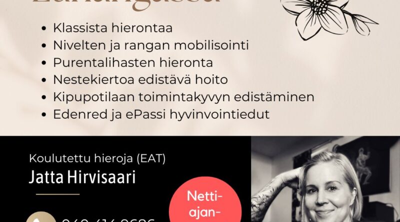 Hyvinvointi ja hieronta JelloKoulutettu hieroja (EAT) Jatta Hirvisaari Huilaamo Vintti & KammariMämminiementie 1 (2. kerros) 19950 Luhanka Olen vuonna 2024 valmistunut