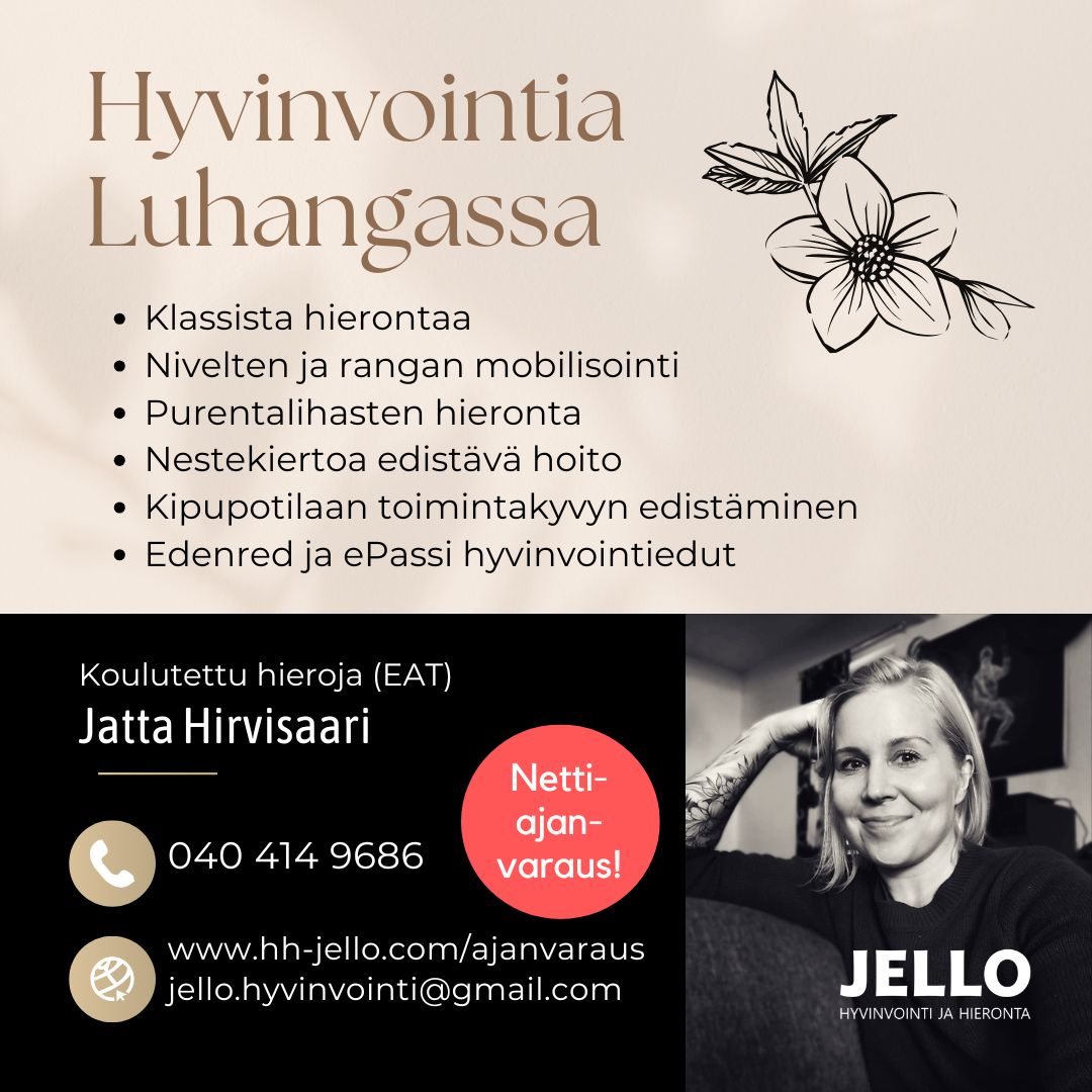 Olen vuonna 2024 valmistunut koulutettu hieroja Tammijärveltä. Olen käynyt myös erikoisammattitutkinnon, jossa olen perehtynyt erilaisiin TULE-kiputiloihin ja kipupotilaiden toimintayvyn edistämiseen. Hyvinvointi ja hieronta Jello on rekisteröity terveyspalvelun tuottaja.