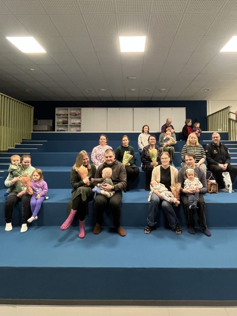 Luhankaan syntyi vuonna 2025 kuusi lasta. Näistä viisi uutta pientä luhankalaista ja heidän perheensä olivat päässeet paikalle kahvitustilaisuuteen.