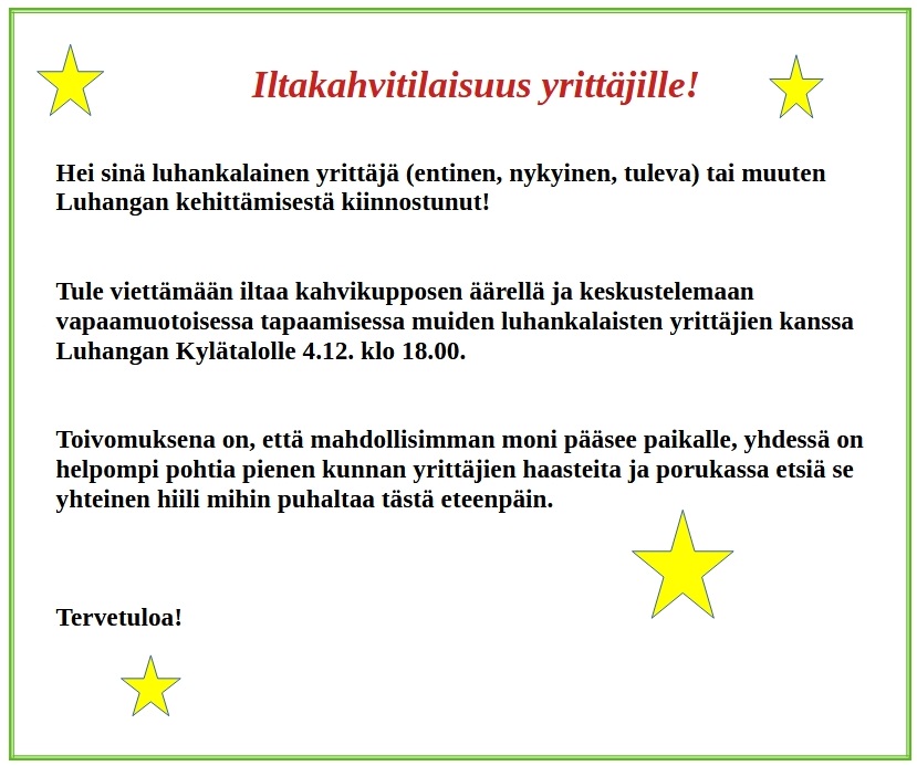 Tule viettämään iltaa kahvikupposen äärellä ja keskustelemaan vapaamuotoisessa tapaamisessa muiden luhankalaisten yrittäjien kanssa Luhangan Kylätalolle 4.12. klo 18.00.