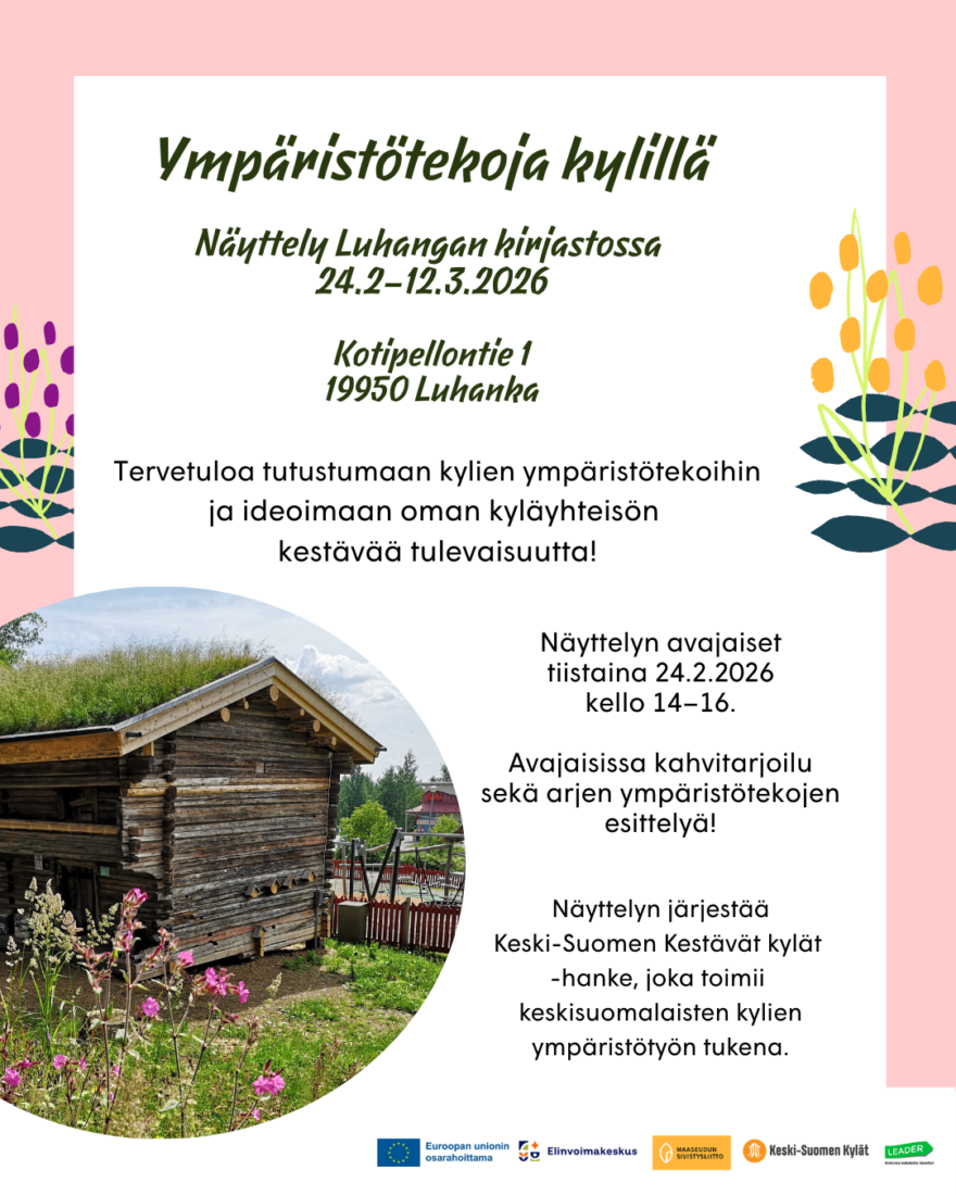 Ympäristötekoja kylillä -näyttely Luhangan pääkirjastossa Kylätalolla (Kotipellontie 1, Luhanka) 24.2.-12.3.2026 kirjaston aukioloaikoina.