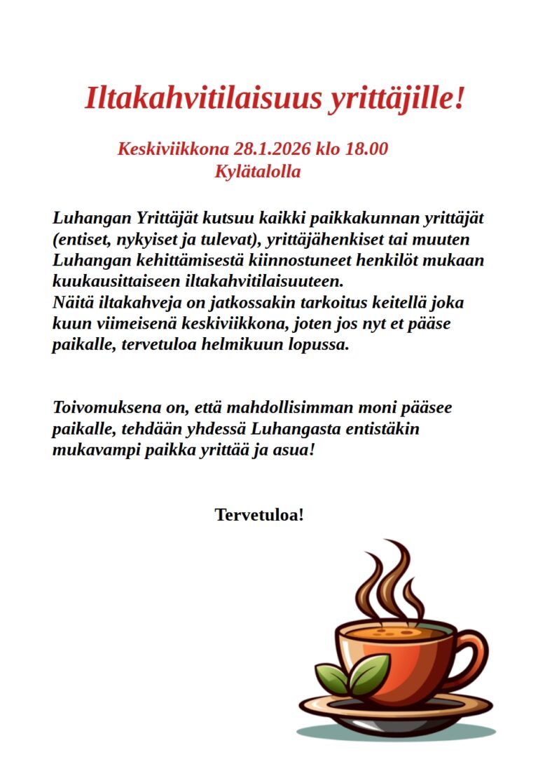 Yrittäjien iltakahvit ke 28.01.2026 klo 18.00 Kylätalolla (Kotipellontie 1, Luhanka).