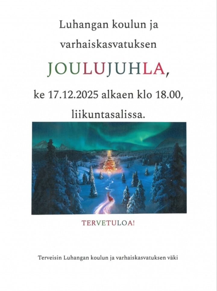 Luhangan koulun ja varhaiskasvatuksen joulujuhla ke 17.12.2025 alkaen klo 18.00 Luhangan koulun liikuntasalissa (Tammijärventie 316, Tammijärvi). Tervetuloa! Terveisin Luhangan koulun |