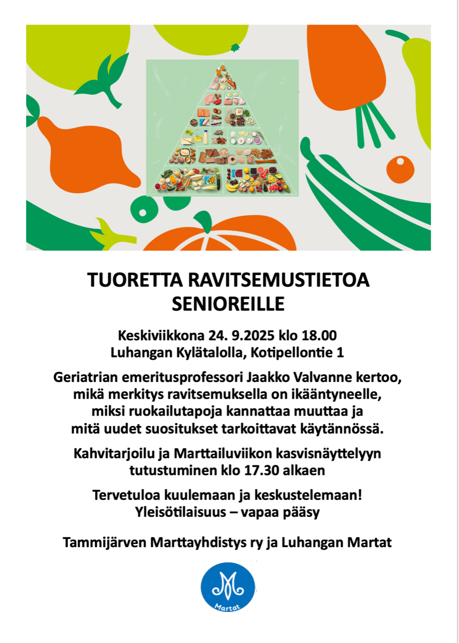 Valtakunnallisen Marttailuviikon kaikille avointa yleisötilaisuutta vietetään Luhangassa Kylätalolla (Kotipellontie 1, Luhanka) keskiviikkona 24.9.2025 klo 18.00. Kahvitarjoilu alkaa klo 17.30. Tapahtumaviikon